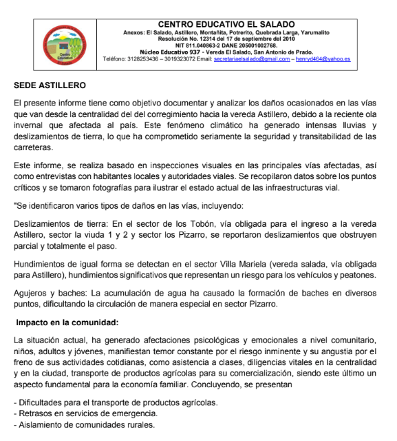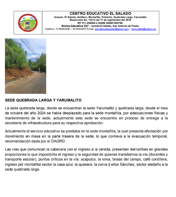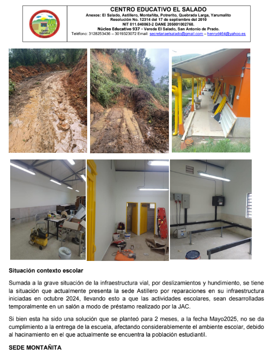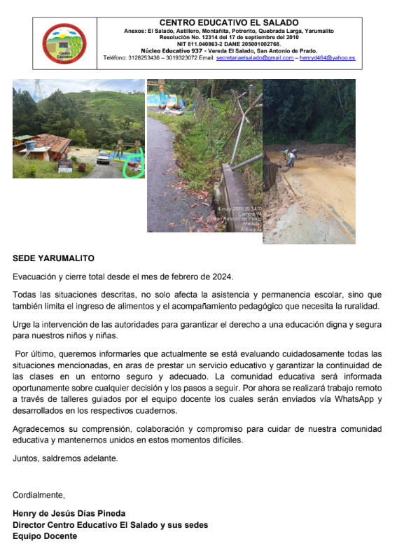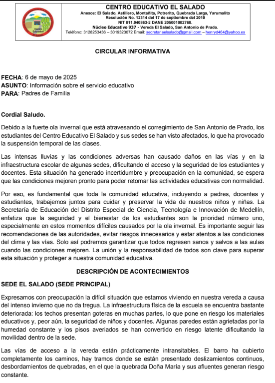 6 de mayo de 2025 – Las intensas lluvias que azotan el corregimiento de San Antonio de Prado han generado una emergencia en el Centro Educativo El Salado y sus sedes en las veredas El Salado, Astillero, Montañita, Potrerito, Quebrada Larga y Yarumalito. Según una circular emitida por la institución, las clases presenciales han sido suspendidas temporalmente debido a los graves daños en la infraestructura escolar y las vías de acceso, poniendo en riesgo la seguridad de estudiantes y docentes.Las fuertes precipitaciones han causado deslizamientos de tierra, hundimientos, baches y desbordamientos de quebradas, como la Doña María,