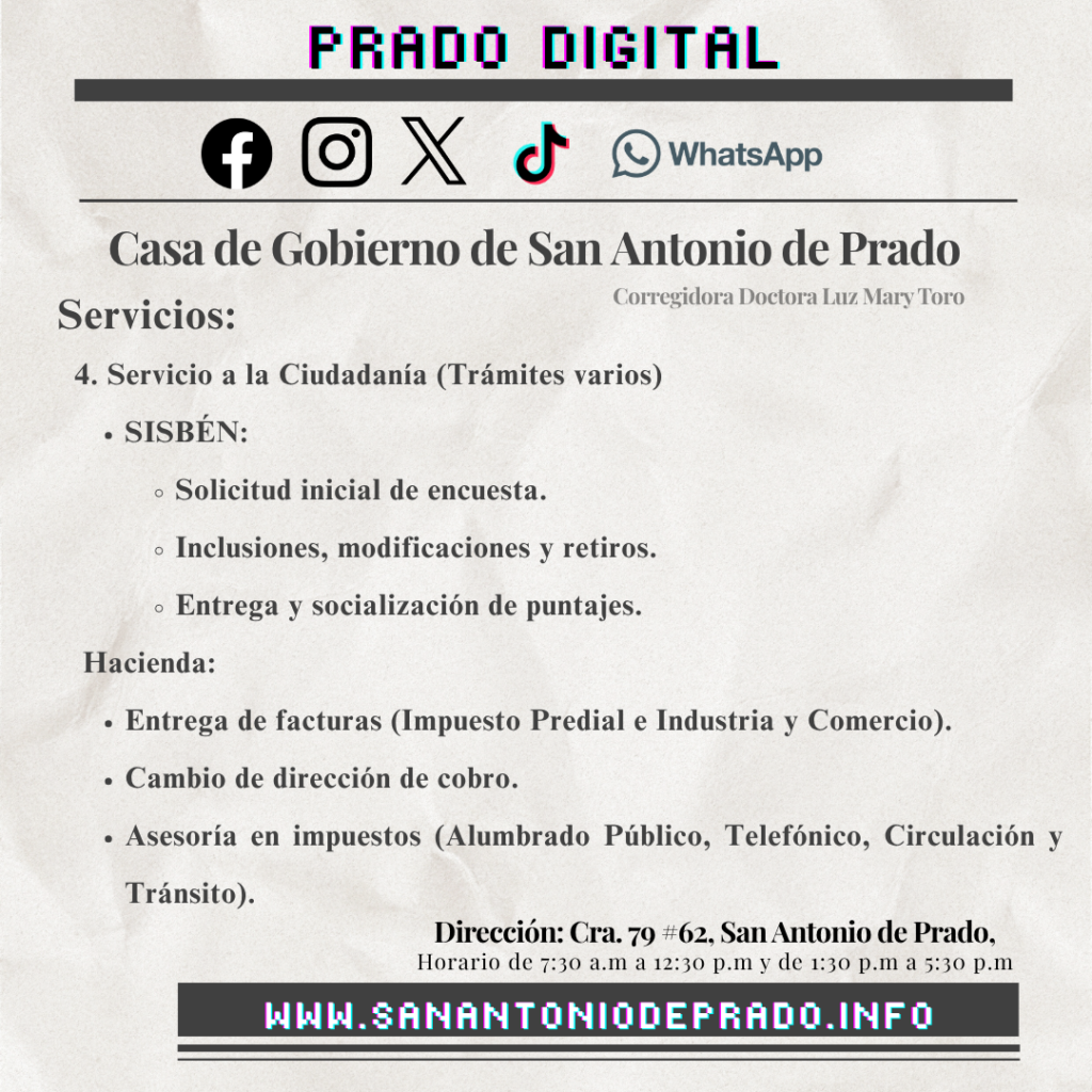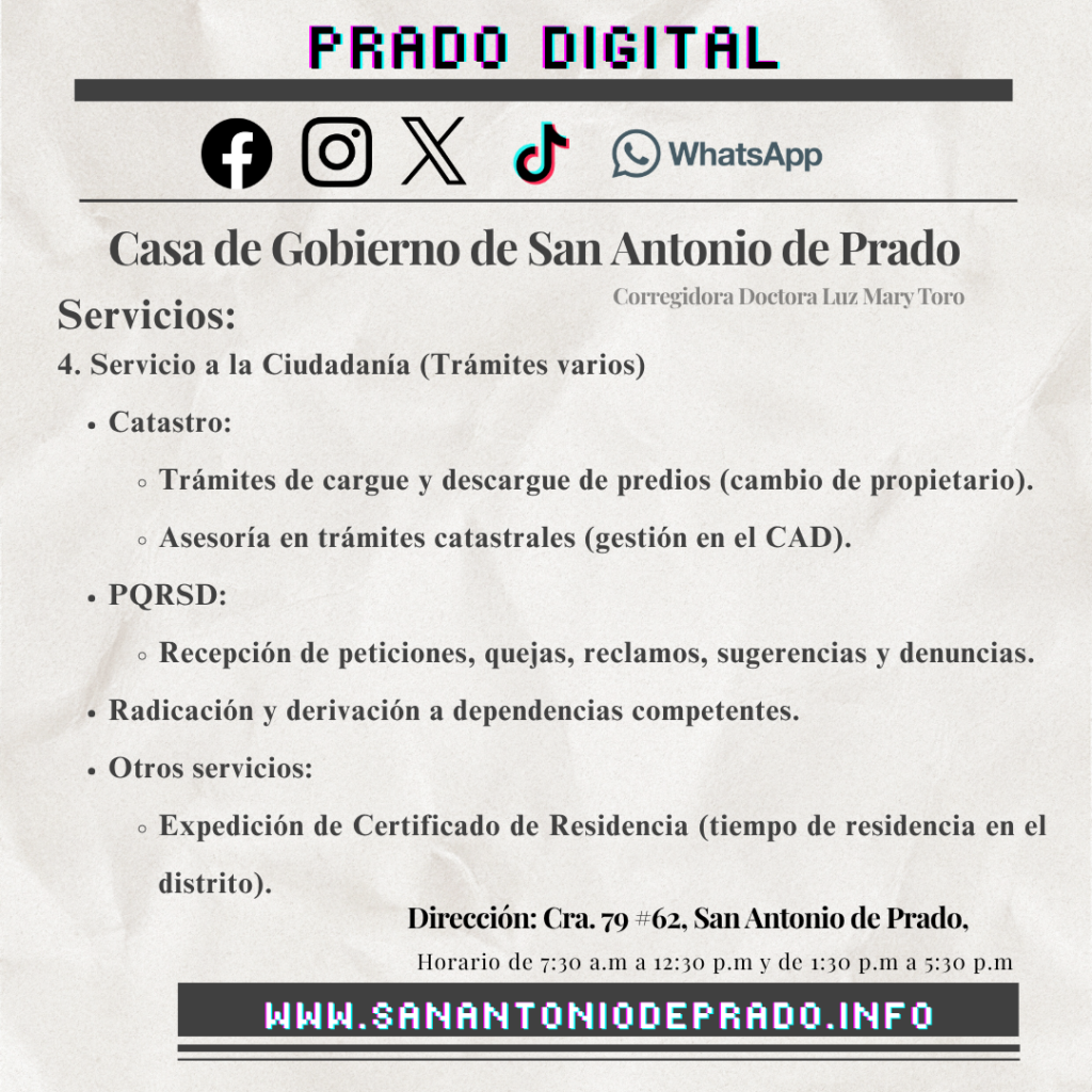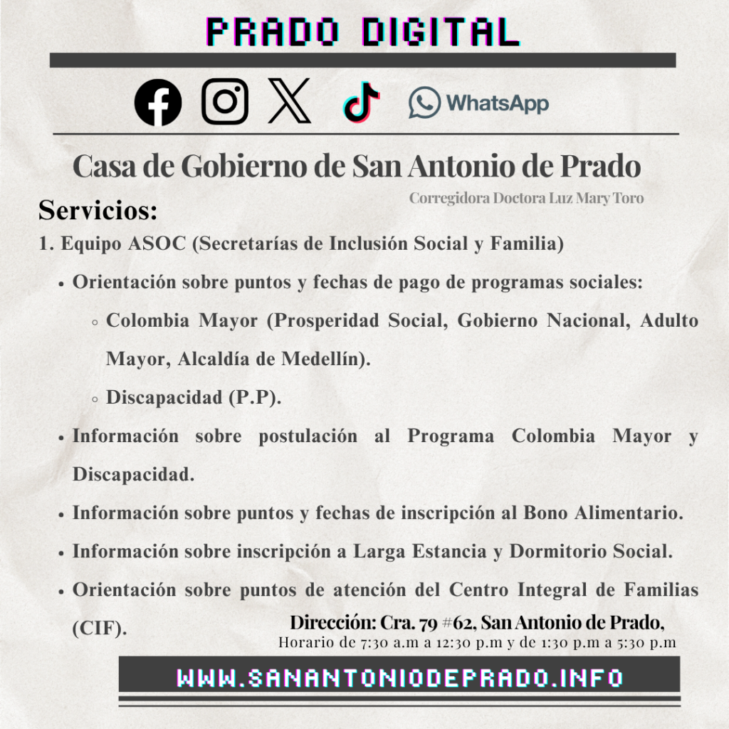 Llamado a la Acción Si vive en San Antonio de Prado , acérquese a la Casa de Gobierno y conozca todos los servicios que puede gestionar cerca de su casa. No espere a necesitarlos urgentemente: la información oportuna evita trámites largos y protege sus derechos.