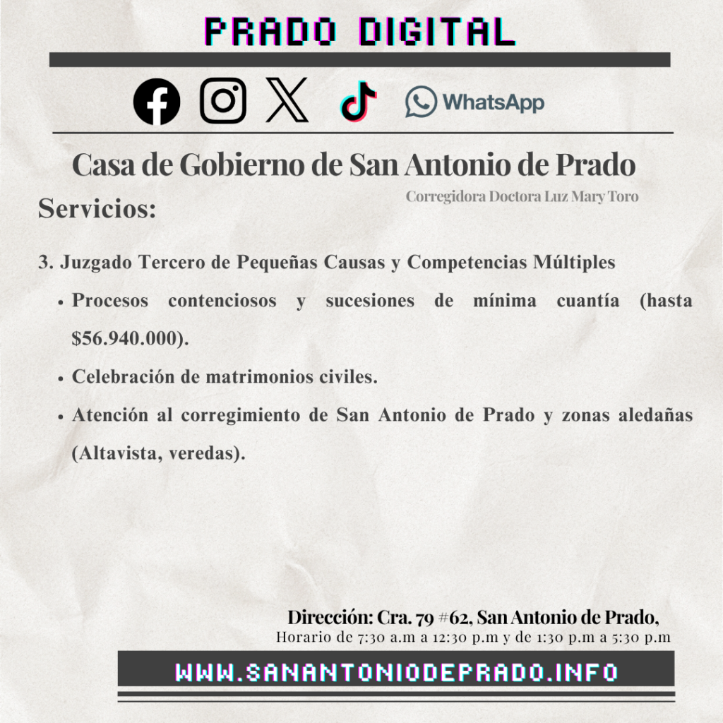 Casa de Gobierno de San Antonio de Prado, Alcaldía de Medellín, Corregimiento de San Antonio de Prado, Comisaría de Familia de San Antonio de Prado, Juzgado Tercero de Pequeñas Causas, Secretaría de Inclusión Social, Secretaría de Salud.