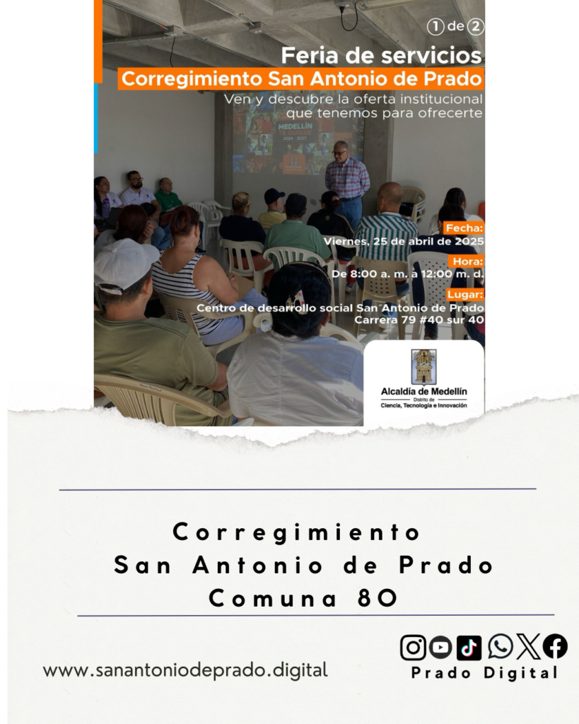 Este viernes, 25 de abril de 2025, te invitamos a nuestra Feria de Servicios en el Centro de Desarrollo Social San Antonio de Prado (Carrera 79 #40 sur 40).