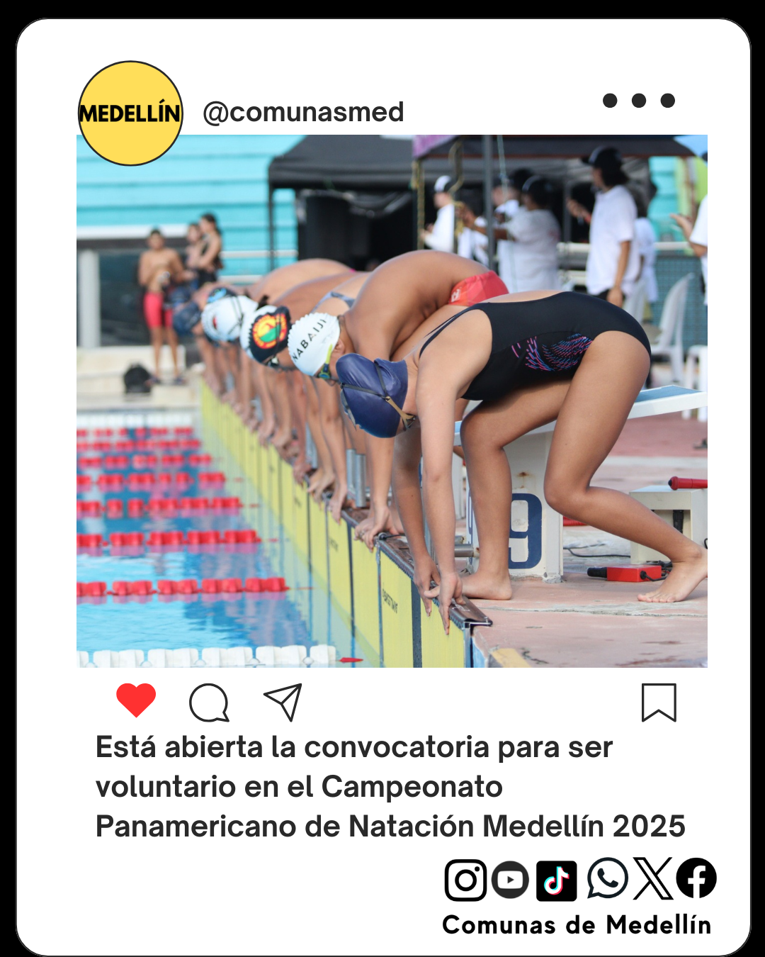 La ciudad tiene abierta la convocatoria para los voluntarios de los PanAm Aquatics Championships Medellín 2025, que reunirá a los mejores nadadores en las modalidades de Carreras, Clavados, Clavados de Altura, Polo Acuático, Natación Artística y Aguas Abiertas de toda América.