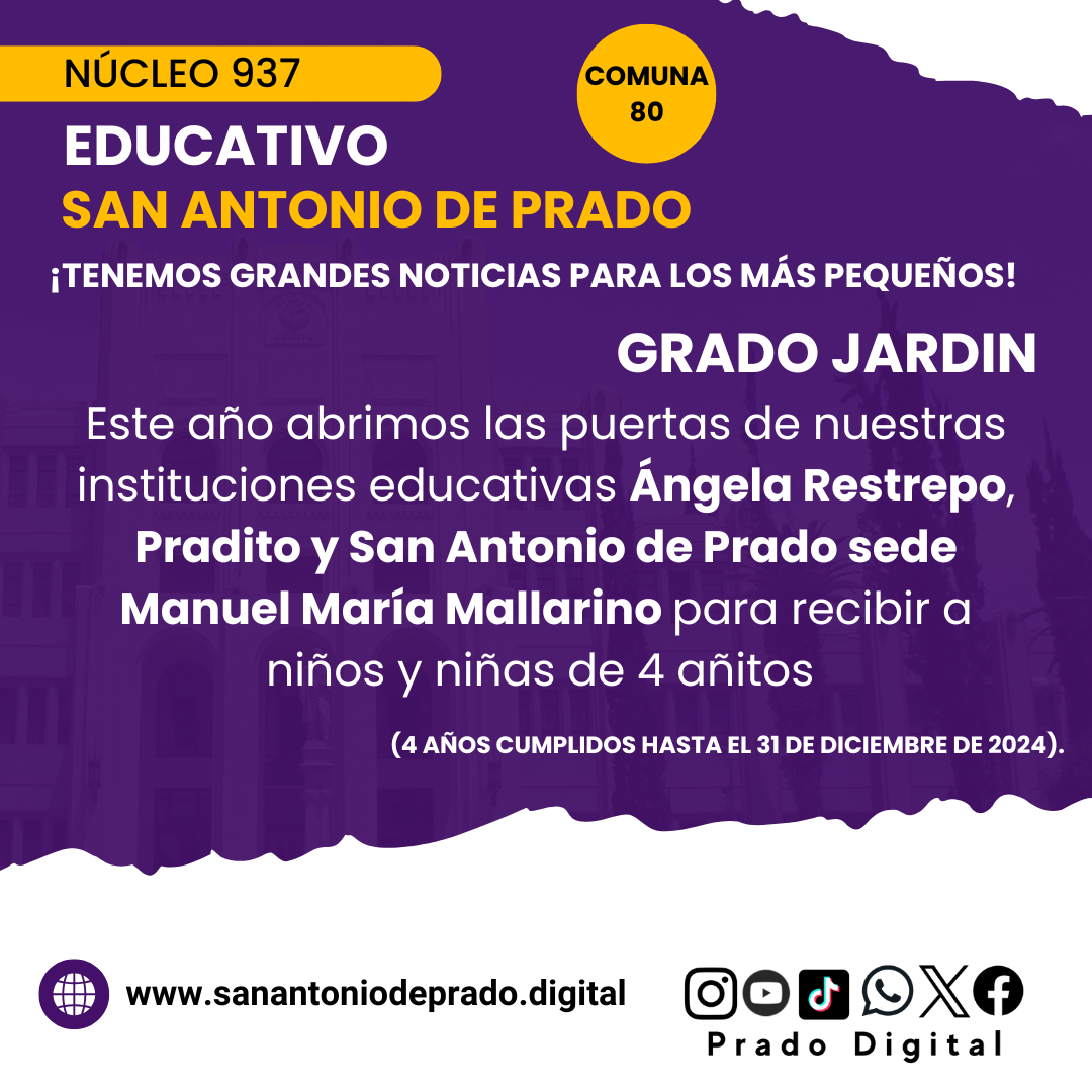 13/01/2025Tenemos grandes noticias para los más pequeños! Este año abrimos las puertas de nuestras instituciones educativas Ángela Restrepo, Pradito y San Antonio de Prado sede Manuel María Mallarino para recibir a niños y niñas de 4 añitos (cumplidos hasta el 31 de diciembre de 2024).…