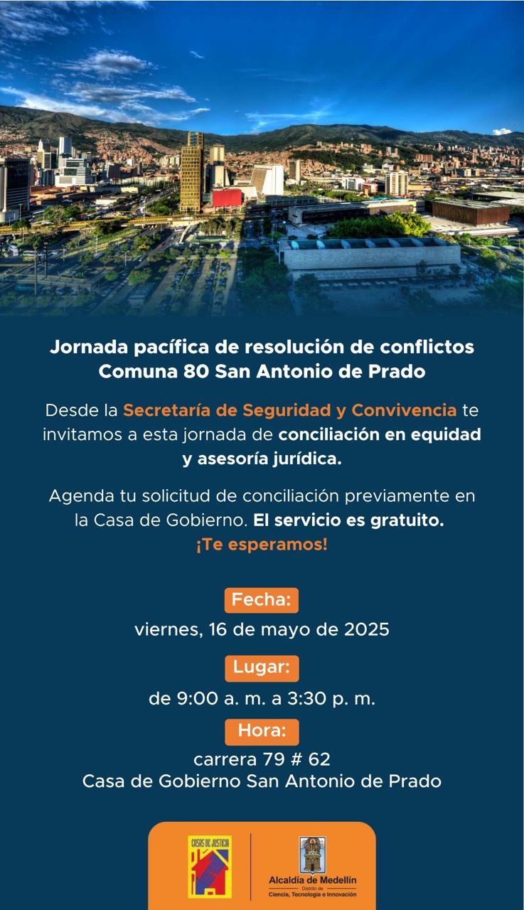 La Corregiduria de San Antonio de Prado y La Casa de Justicia El Bosque te invitan a una jornada pacífica de resolución de conflictos y asesoría jurídica el 16 de mayo de 2025, de 9:00 a.m. a 3:00 p.m., en la Casa de Gobierno.